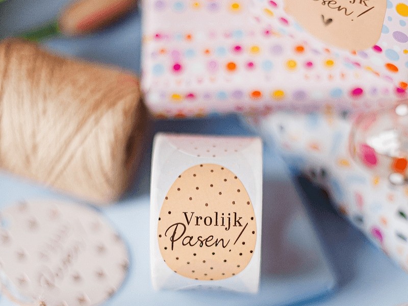 Artikelnummer: 019001 Deze leuke “Vrolijk Pasen” stickers in paasei-vorm geven elk cadeautje of bestelling een extra persoonlijk tintje. Perfect om paasgeschenken, traktaties of verpakkingen feestelijk af te werken. Dankzij de permanente belijming zijn ze ideaal als sluitsticker of om kleine geschenken liefdevol te presenteren met Pasen. De stickers hebben een formaat van 36 x 50 mm en worden geleverd op een rol van 250 stuks. Je ontvangt 5 verschillende varianten in pastelkleuren met goudfolie opdruk voor een speels en vrolijk effect.