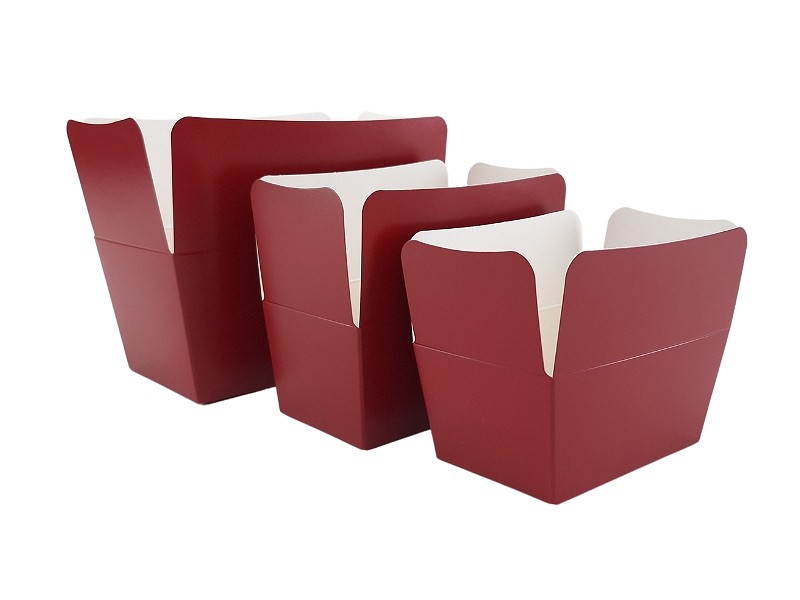 Artikelnummer: 3370BR Luxe bordeaux rode bonbondoosjes voor het verpakken van bonbons, pralines, truffels en andere chocolaatjes. Naast chocolade verpakking is een ballotin ook heel goed als geschenkverpakking te gebruiken. De grotere formaten worden zelfs gebruikt voor het verpakken van kleine gebakjes zoals cupcakes en petit fours. De pralinedoosjes zijn wit aan de binnenzijde en worden (plano) geleverd inclusief een goud glimmend bodemkarton. Op zoek naar een andere kleur?